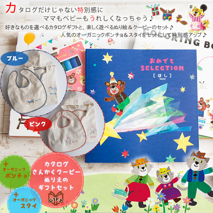 そして、カタログと一緒にさんかくクーピーとぬり絵がセットになっています!ひとつで何度も、長く楽しめる、そんな出産祝いのカタログギフトです!さらに、そんなカタログギフトにセットにするのは、弊店の人気アイテム、オーガニックポンチョとスタイ。