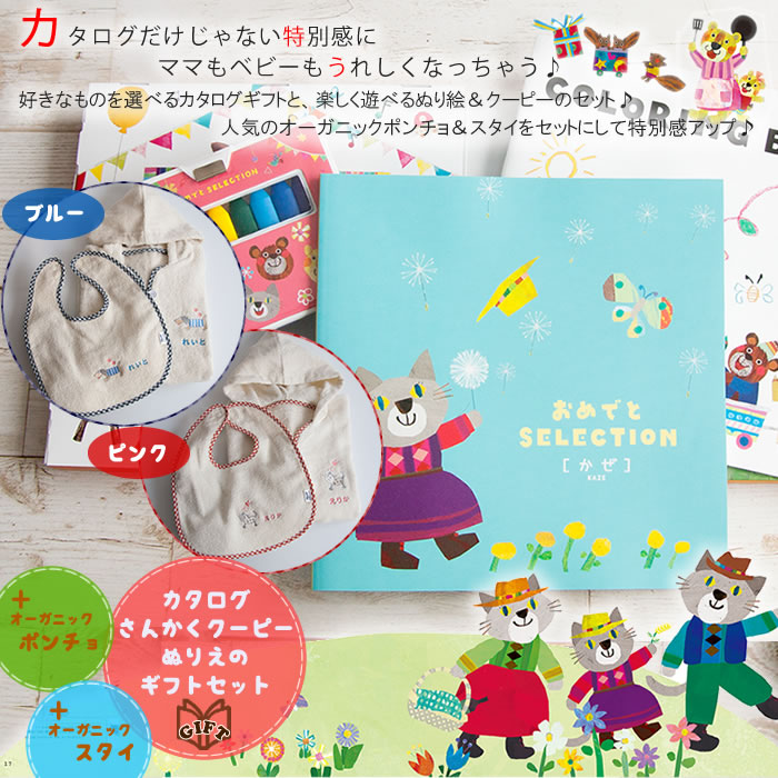 そして、カタログと一緒にさんかくクーピーとぬり絵がセットになっています!ひとつで何度も、長く楽しめる、そんな出産祝いのカタログギフトです!さらに、そんなカタログギフトにセットにするのは、弊店の人気アイテム、オーガニックポンチョとスタイ。